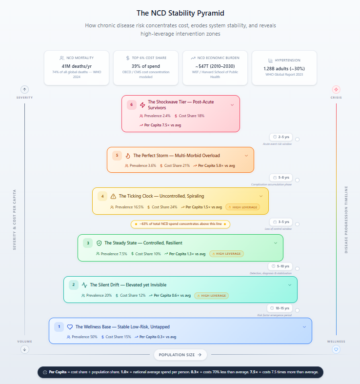 In the modeled distribution, the top 6% of the population accounts for 39% of NCD spending. Nearly two-thirds of total NCD expenditure occurs in the upper three tiers. Per-capita costs in the post-acute cohort are approximately 7.5 times the system average. Even modest expansion of high-severity cohorts materially increases total expenditure.